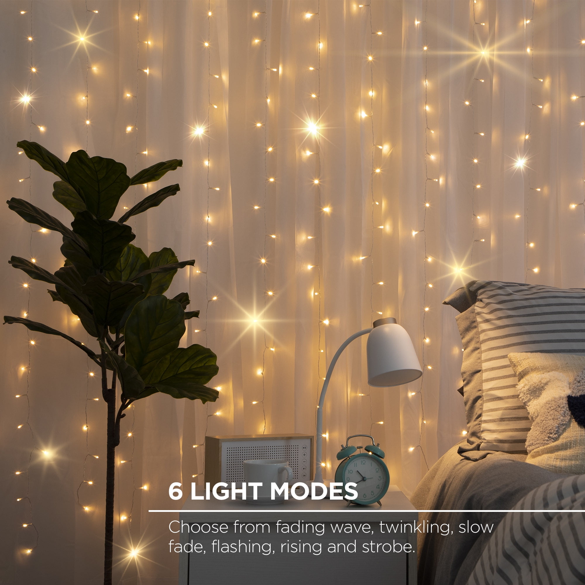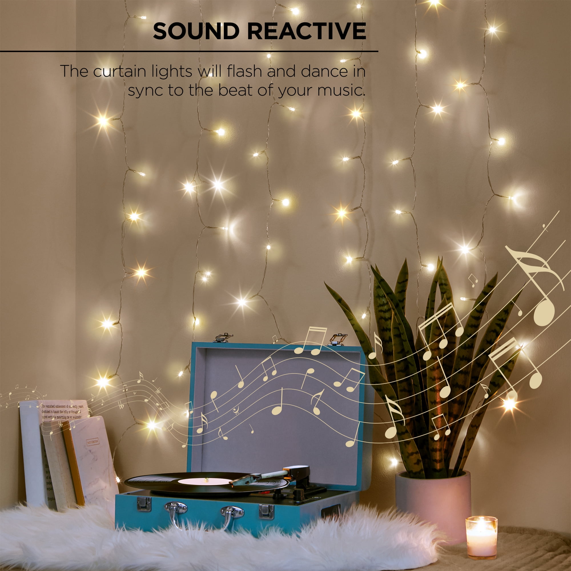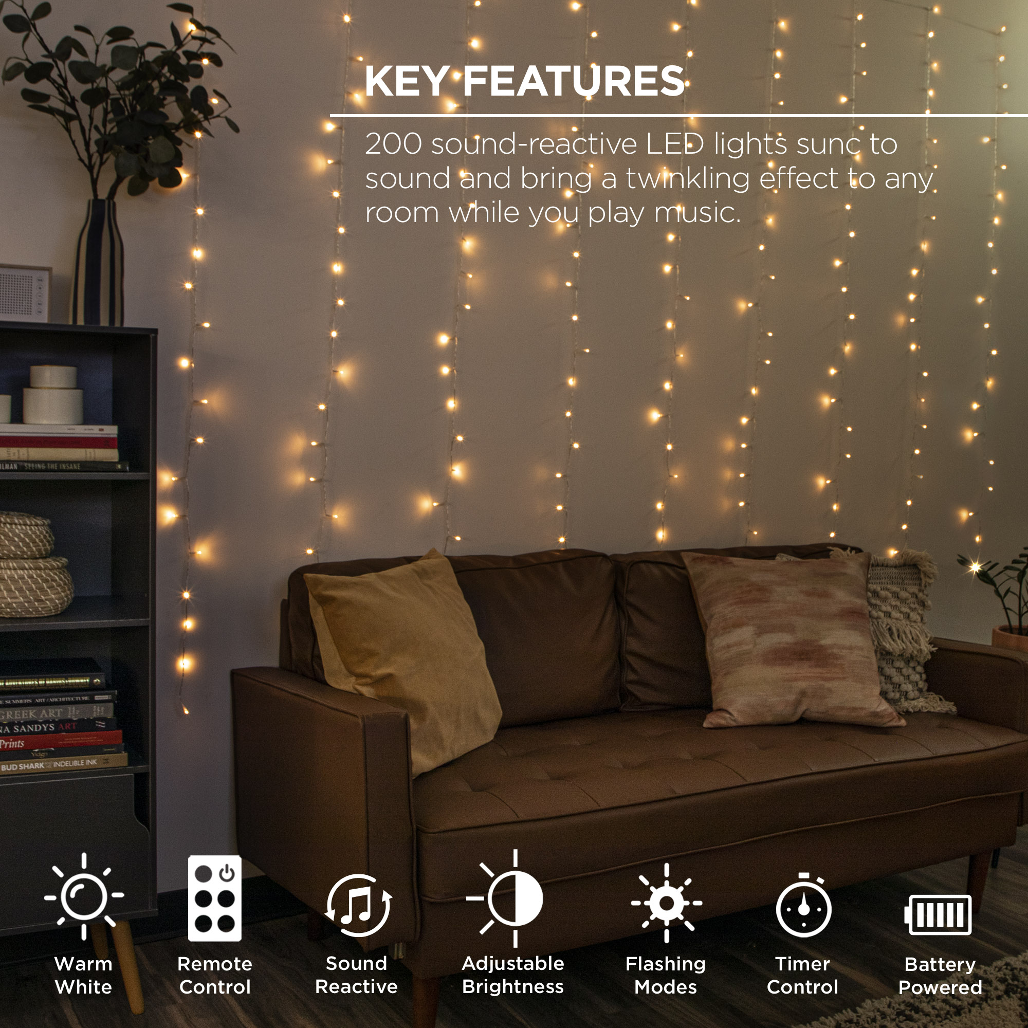 Bring a warm white glow to your indoor or outdoor space with these cascading curtain lights! The 200 LED lights are arranged in 8 strands hanging from a connecting strand for easy hanging and a beautiful warm effect. The included remote allows you to control power, effect modes, timer and more. Select one of the Sound Reactive modes for a light show in-sync with your music.