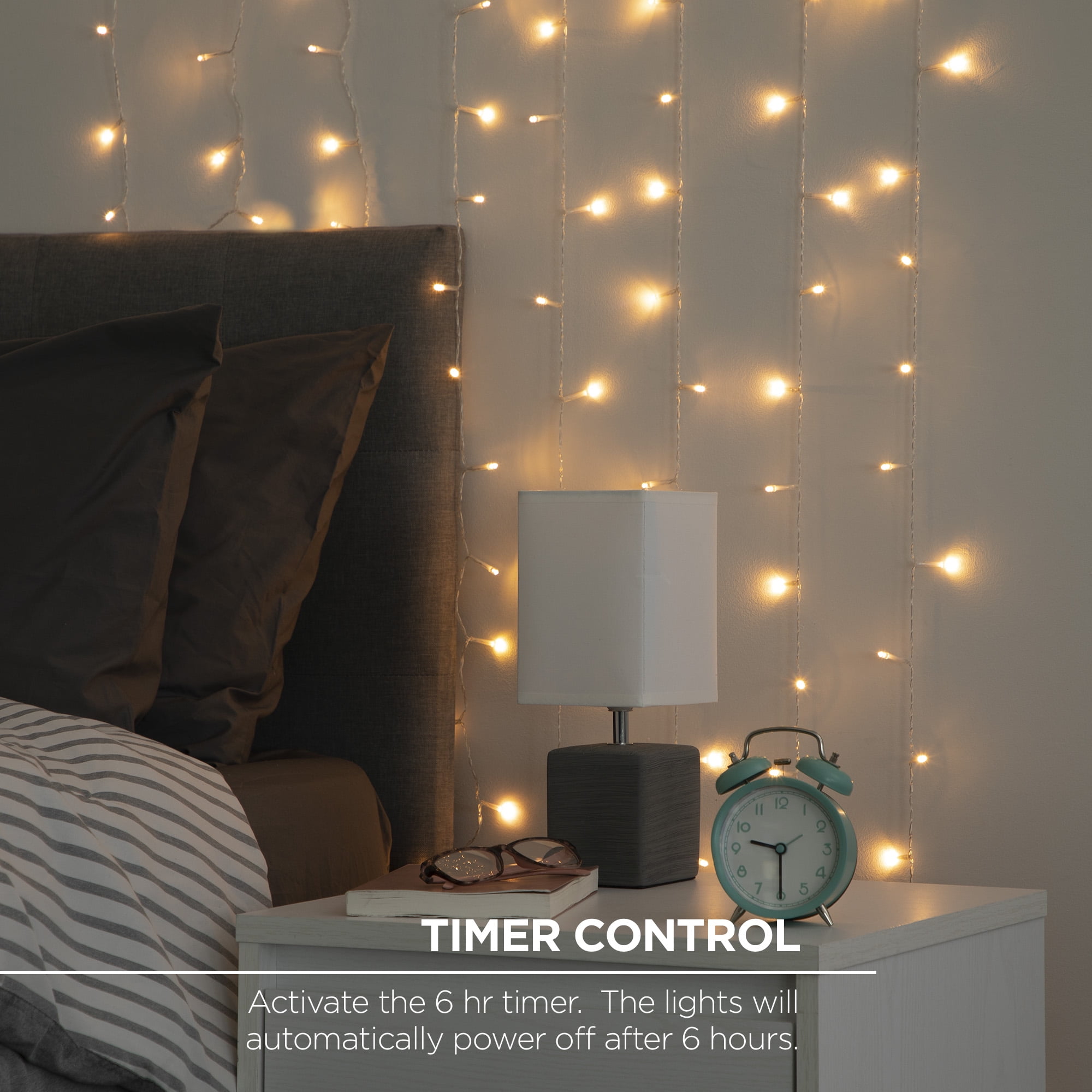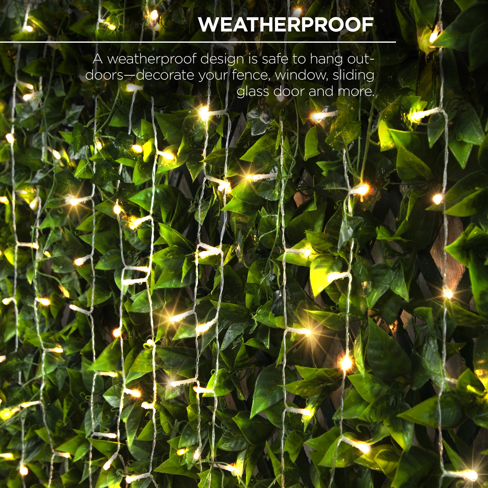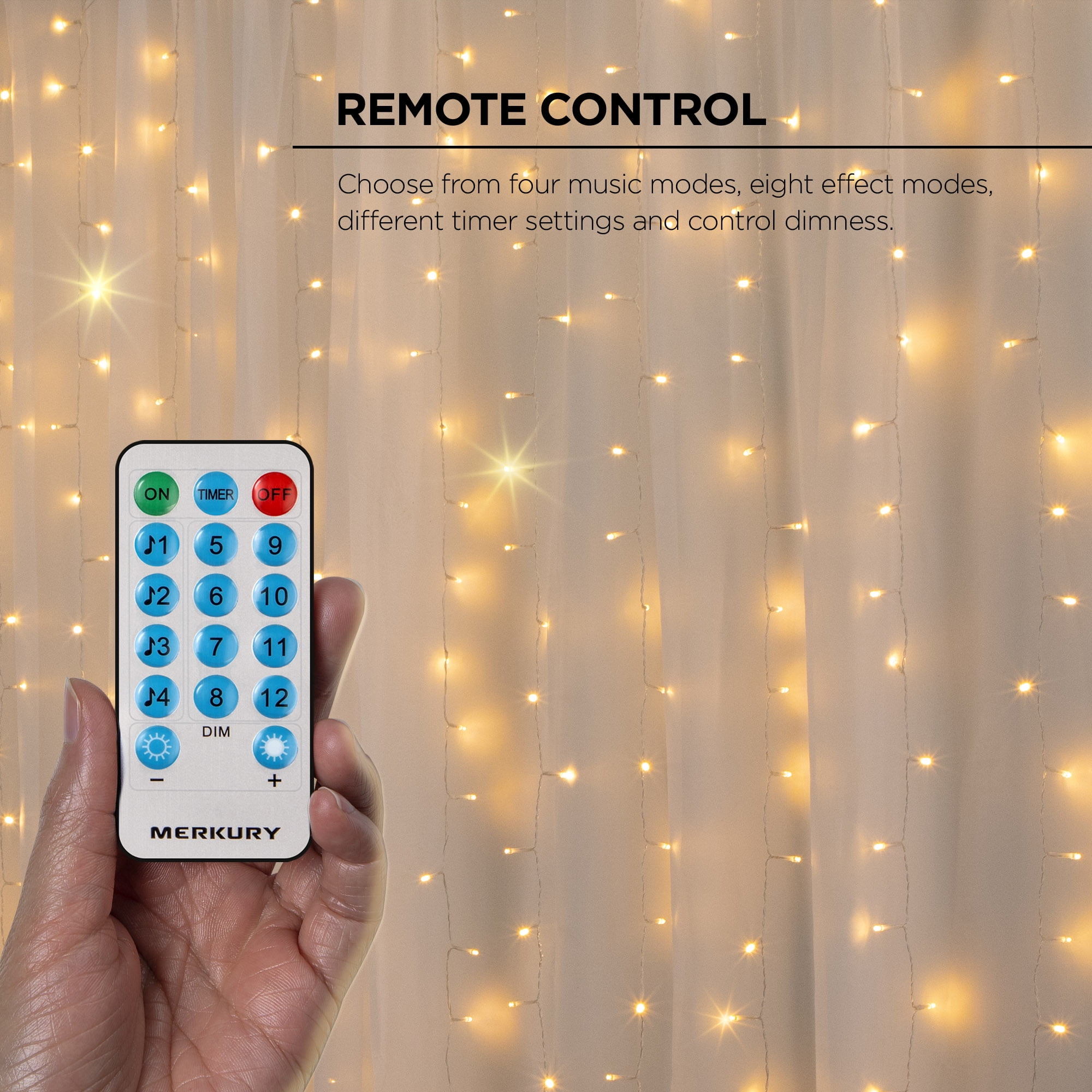 Bring a warm white glow to your indoor or outdoor space with these cascading curtain lights! The 200 LED lights are arranged in 8 strands hanging from a connecting strand for easy hanging and a beautiful warm effect. The included remote allows you to control power, effect modes, timer and more. Select one of the Sound Reactive modes for a light show in-sync with your music.
