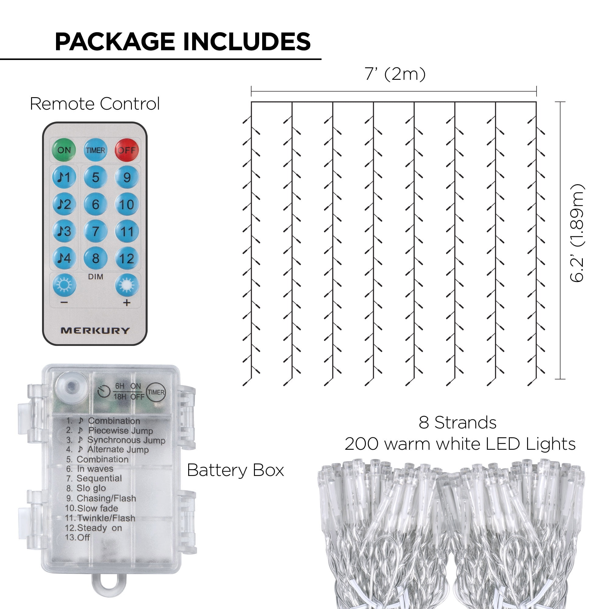 200 multicolor LED lights 8 strands of light Sound-reactive modes Flash and fade modes 7ft. wide x 6.2ft. long Timer modes Dimmable Weatherproof battery box (uses 3 AA batteries; not included)