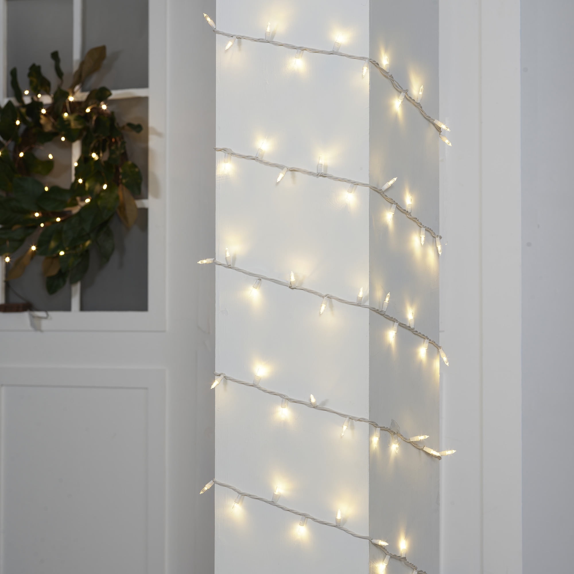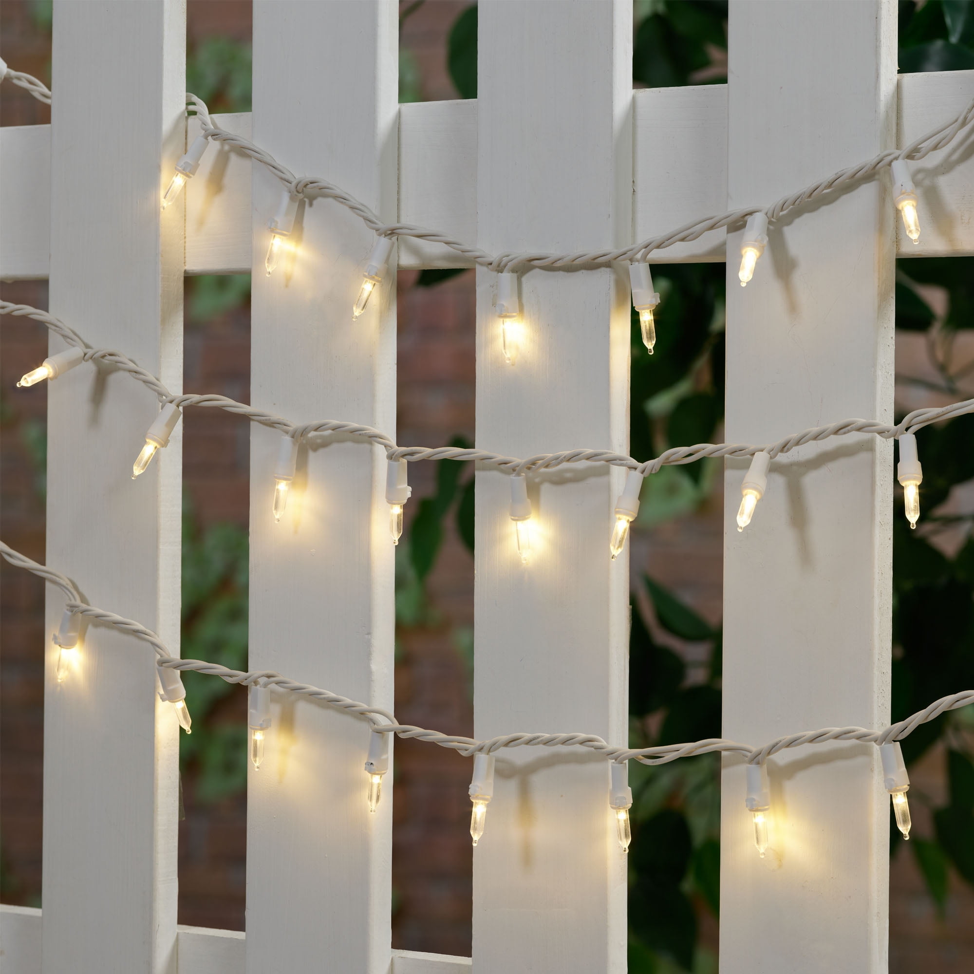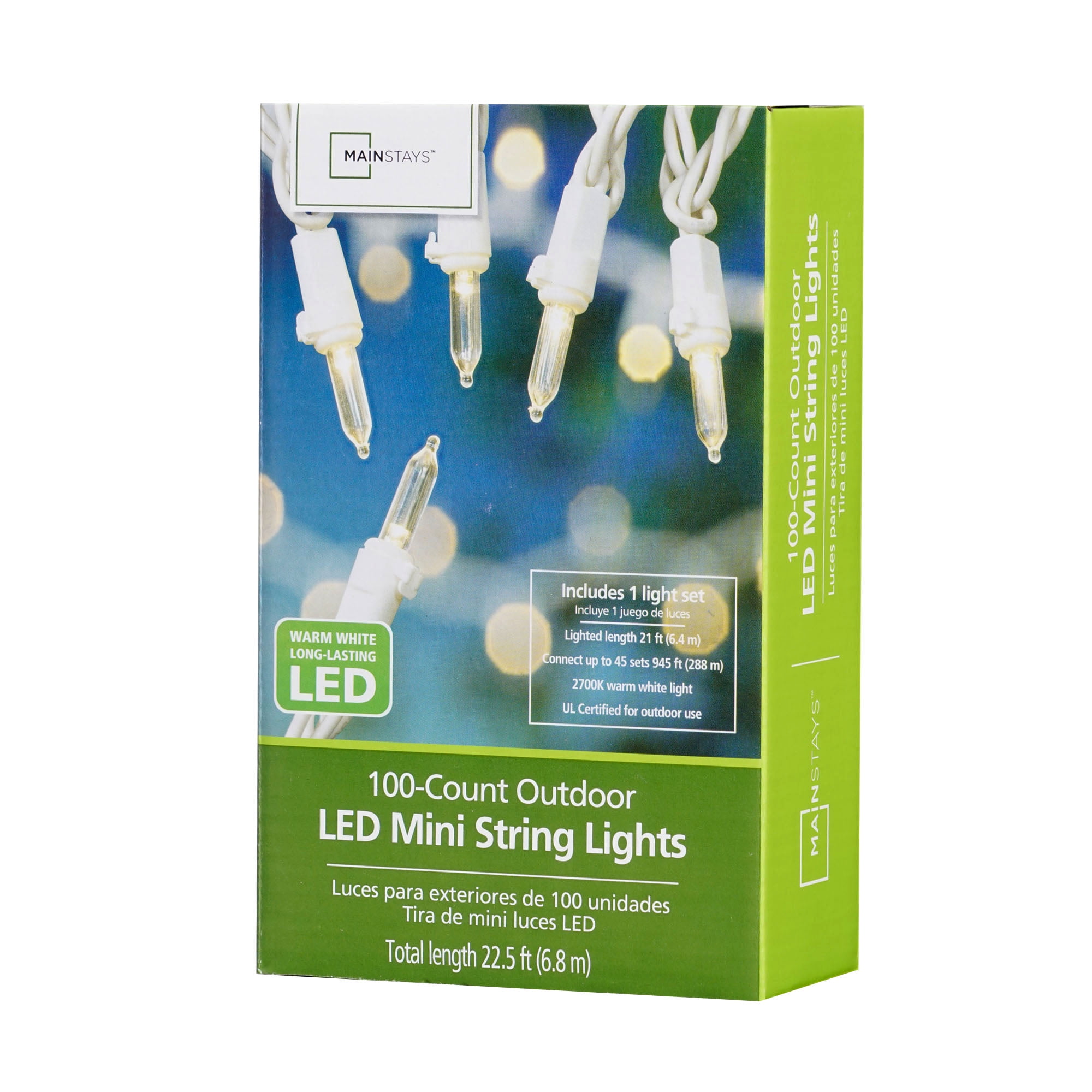 & Free ShippingLight up your porch, patio, balcony, or deck with the Mainstays 100 Count Outdoor LED Mini String Lights, White Wire. These incandescent-style glass reflector bulbs are steady burning and glow with warm white LED light to add an inviting, festive look to your outdoor living spaces. Recommended for both indoor and outdoor use, these versatile lights are also the perfect way to add soft light to a bedroom, rec room, or dorm room. With 100 glass mini bulbs on a total lighted length of 19.5 feet, these mini string lights can be used as a single string or you can connect up to 45 strands of this exact light set to span a larger area. The lighting string is rated 4.8 watts (0.04 amps), do not overload. Connect other lighting strings or decorative outfits end-to-end up to a maximum of 216 watts (1.8 Amps) total. 2700K warm white light.