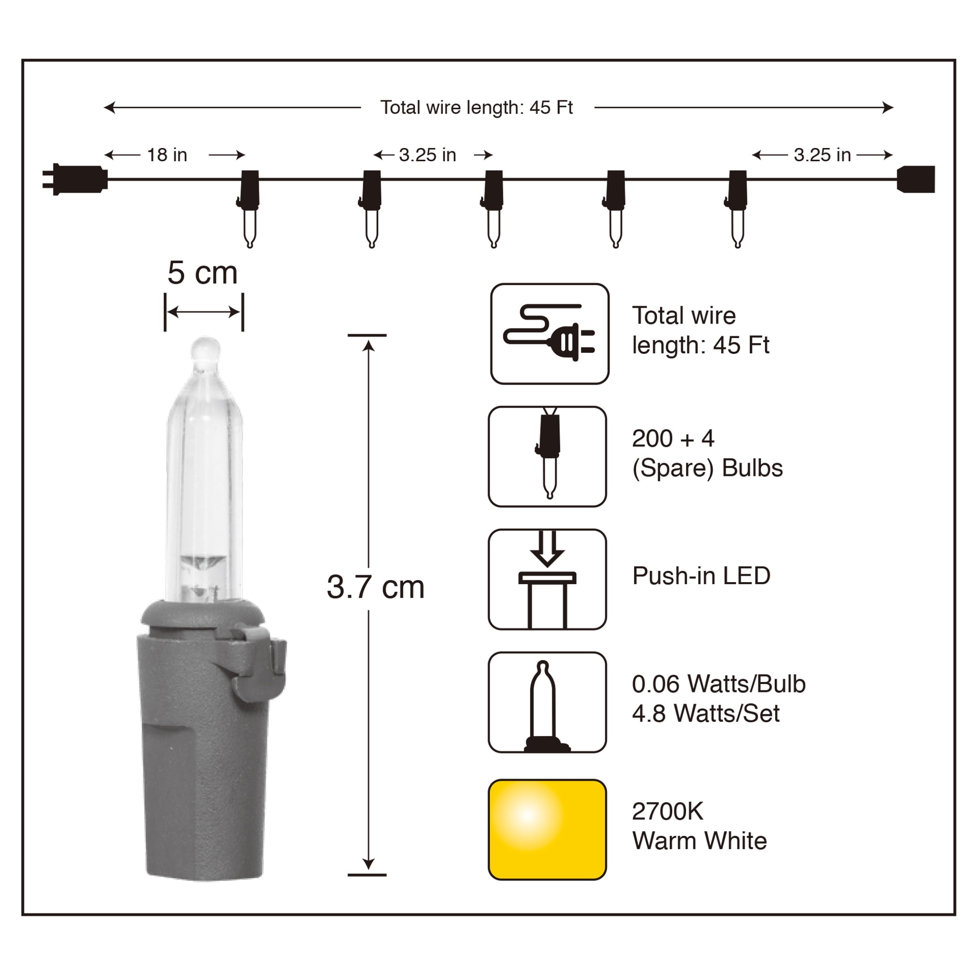 100 Count Outdoor LED Mini String Lights, warm white LED lights, white wire Indoor and outdoor use 19.5 feet lighted length total length 21 feet Incandescent style steady burning glass bulbs Can connect to up to 45 sets of this exact light strand Perfect for use on a patio, porch, deck, or numerous inside spaces