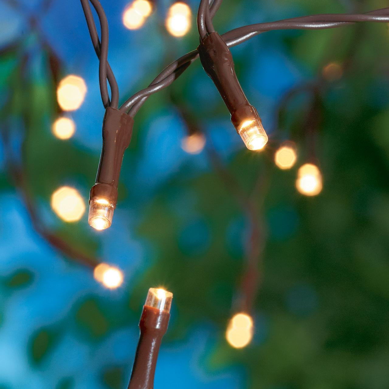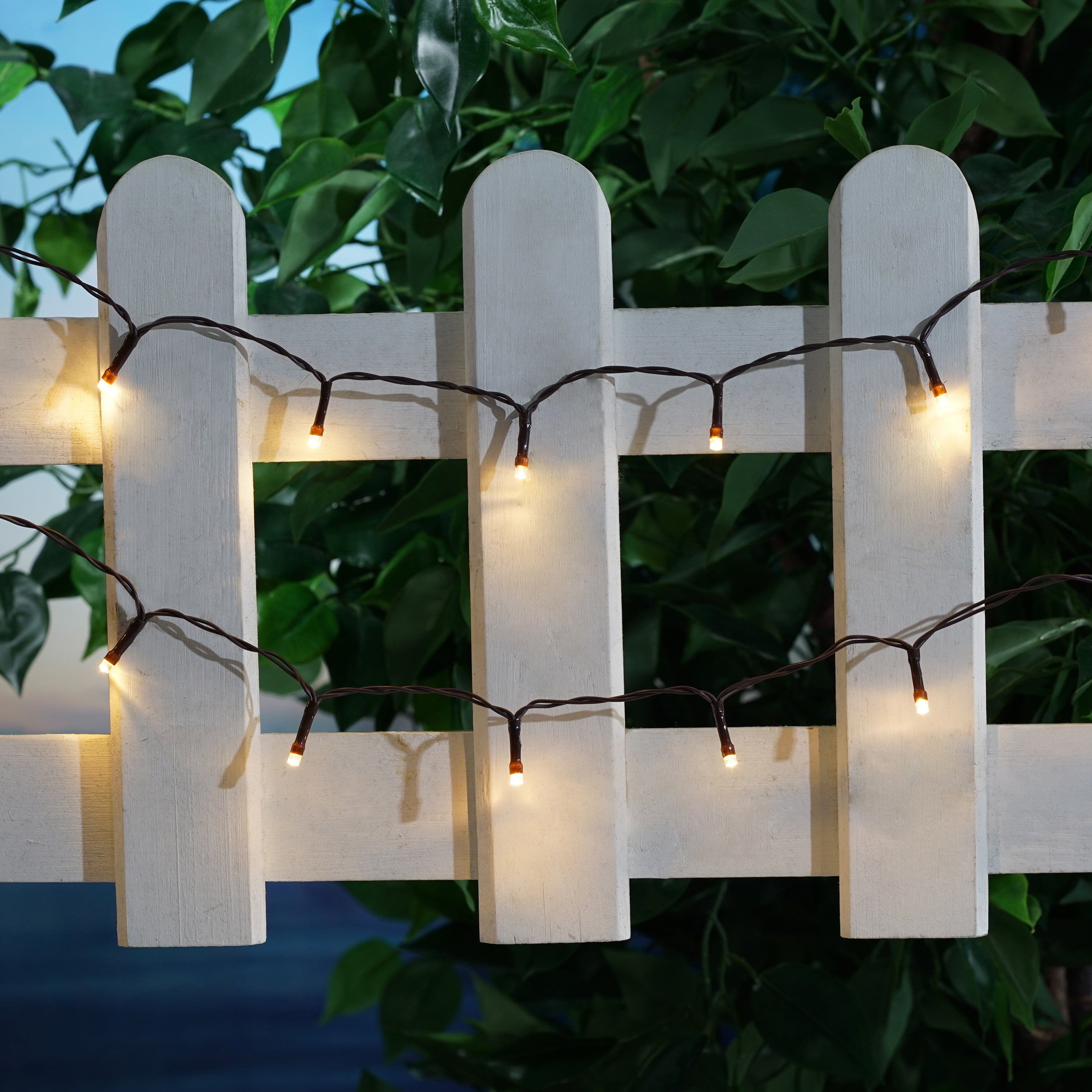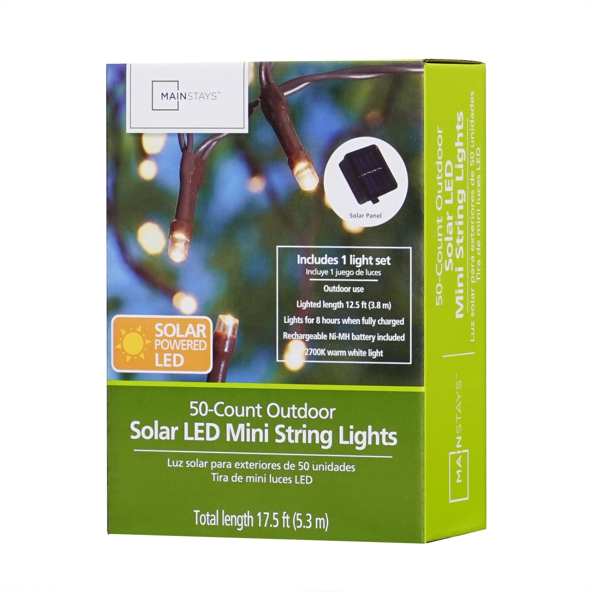 & Free ShippingMainstays Solar 50-count Warm White LED Mini String Lights on Brown Wire are designed to be functional and decorative. These warm white steady-burning LED lights are on brown wire to blend in with just about any dark-colored surface you attach them to. After the sun goes down, these mini solar-powered lights add the perfect amount of light long into the evening. These lights are ideal for patios and gardens to drape over shrubs and bushes. The lights will turn on automatically at dusk and glow continuously for up to 8 hours when fully charged. The set has an on/off switch and includes one 500 mA Ni-MH rechargeable battery along with a plastic stake for easy placement. With a lighted length of 12.5 ft. and a total length of 17.5 feet, this light set can light up all your outdoor parties and events. These solar-powered LED mini lights save energy and money as they light up with zero cost. Outdoor use only. 2700K warm white light.