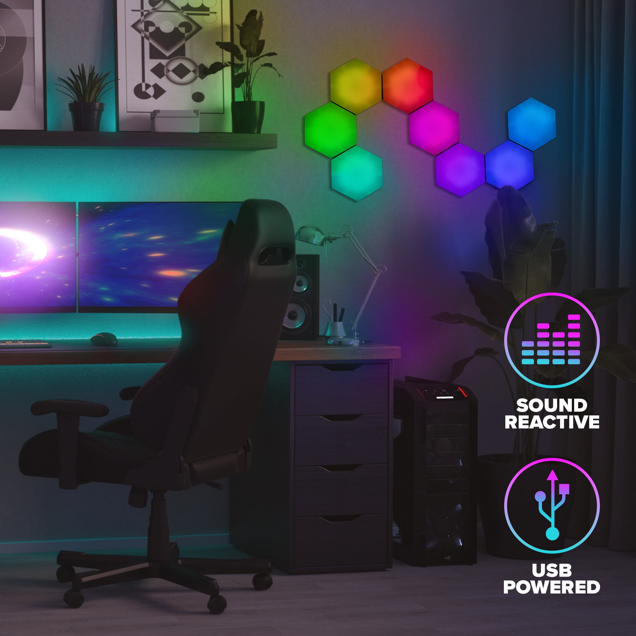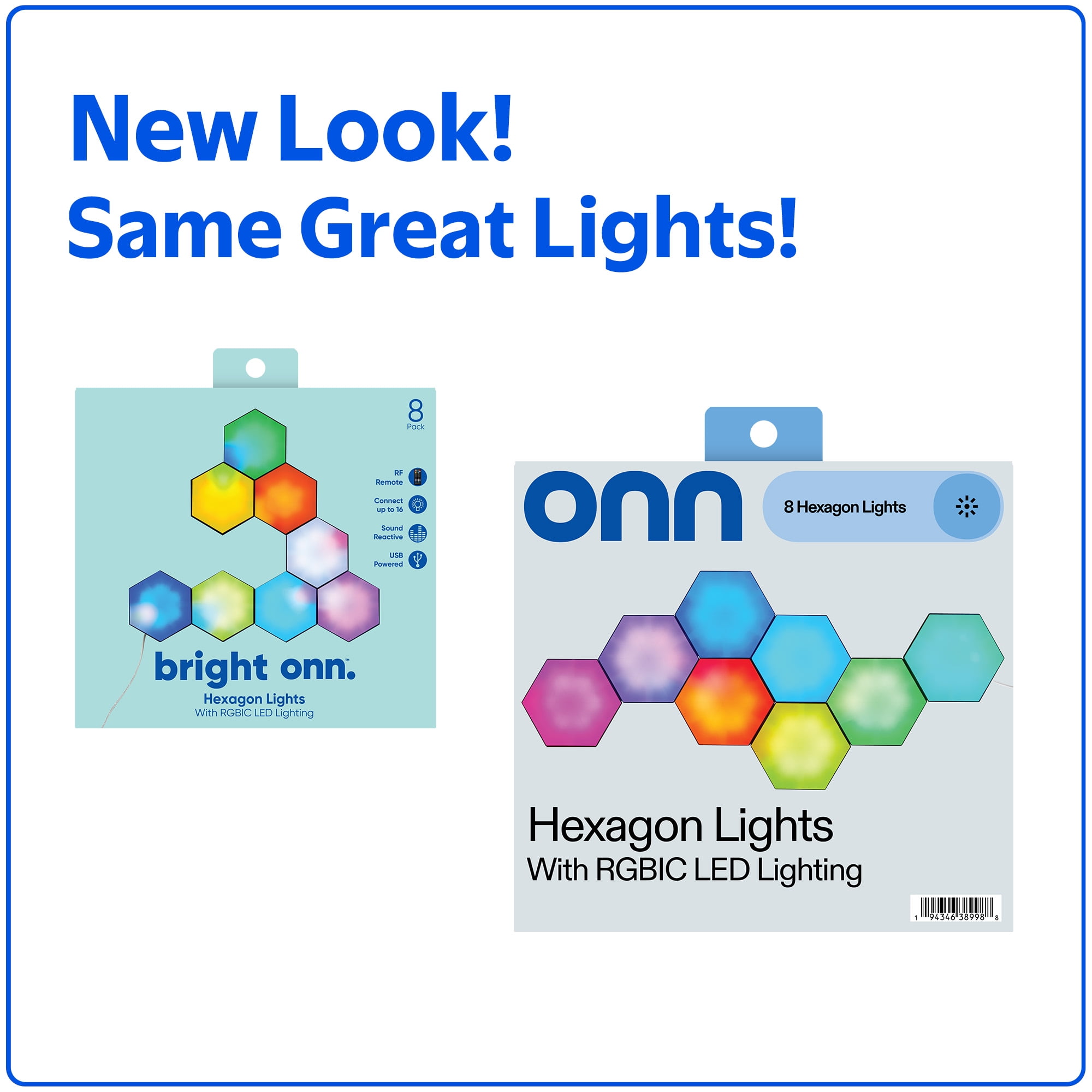 8 Onn Hexagon Lights included RGBIC multi-color changing technology displays multiple colors on one light Sound-reactive lighting responds to your music Solid and multi-color modes include dynamic color-chasing, and timer modes Connect up to 16 USB powered RF remote included
